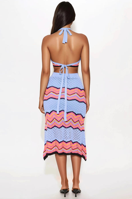"Experience ultimate comfort and style with UP CLOSE Skirt Set. The stretchy crochet material provides a perfect fit, while the high-waisted skirt and halter top add a touch of chic to your wardrobe. Easily adjust the fit with the self-tie closure and elastic waistband. Unleash your inner fashionista with this must-have set!"